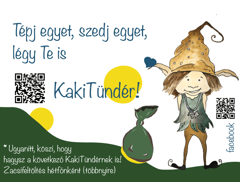 A karakter emellett segít, hogy kommunikáljak az alapvetően elég furcsa kis projektemről. Illetve szerepel a plakáton is, ami mellé hetente kiteszek egy adag kakizacsit a környékünkön, hogy ha valaki megszorul, akkor tudja, hogy van egy pont a séta során, ahol a KakiTündér heti egyszer feltankolja a készletet.